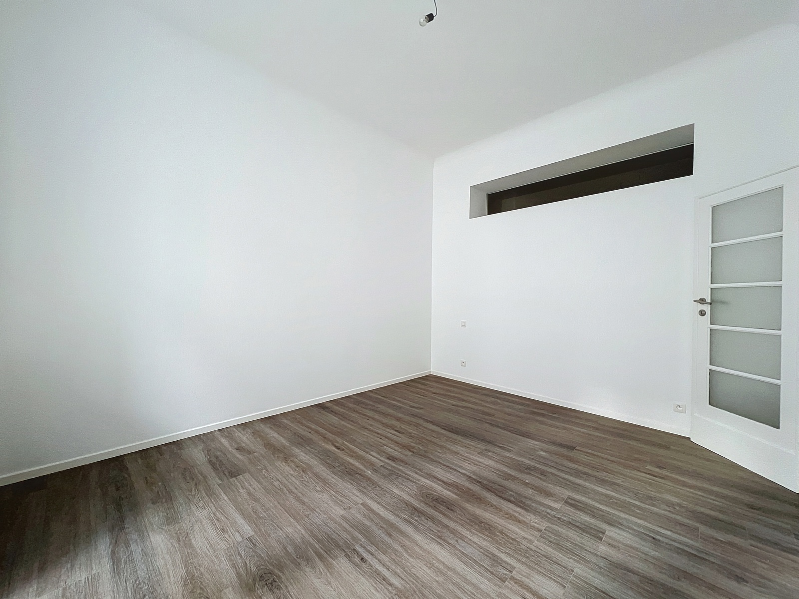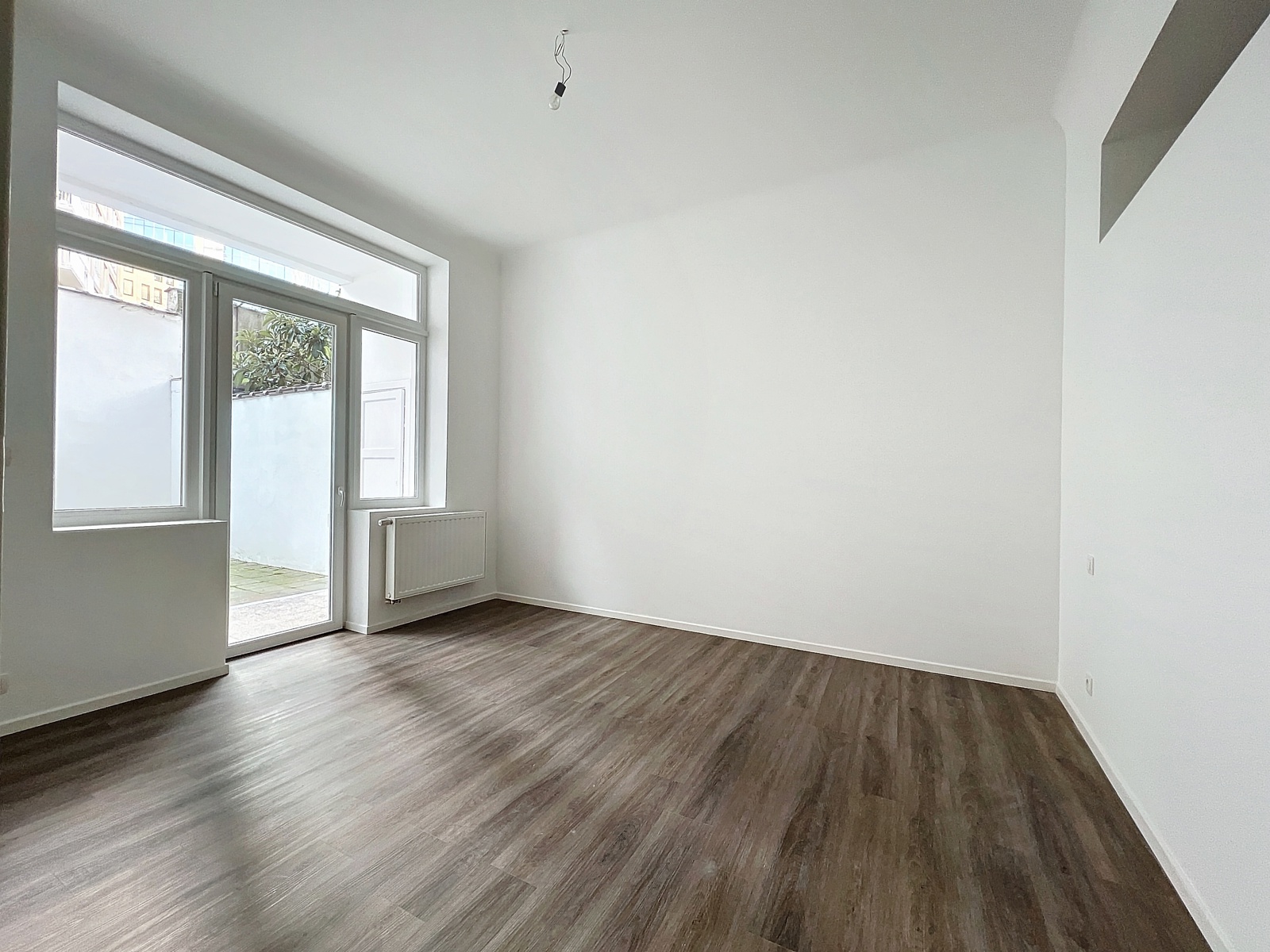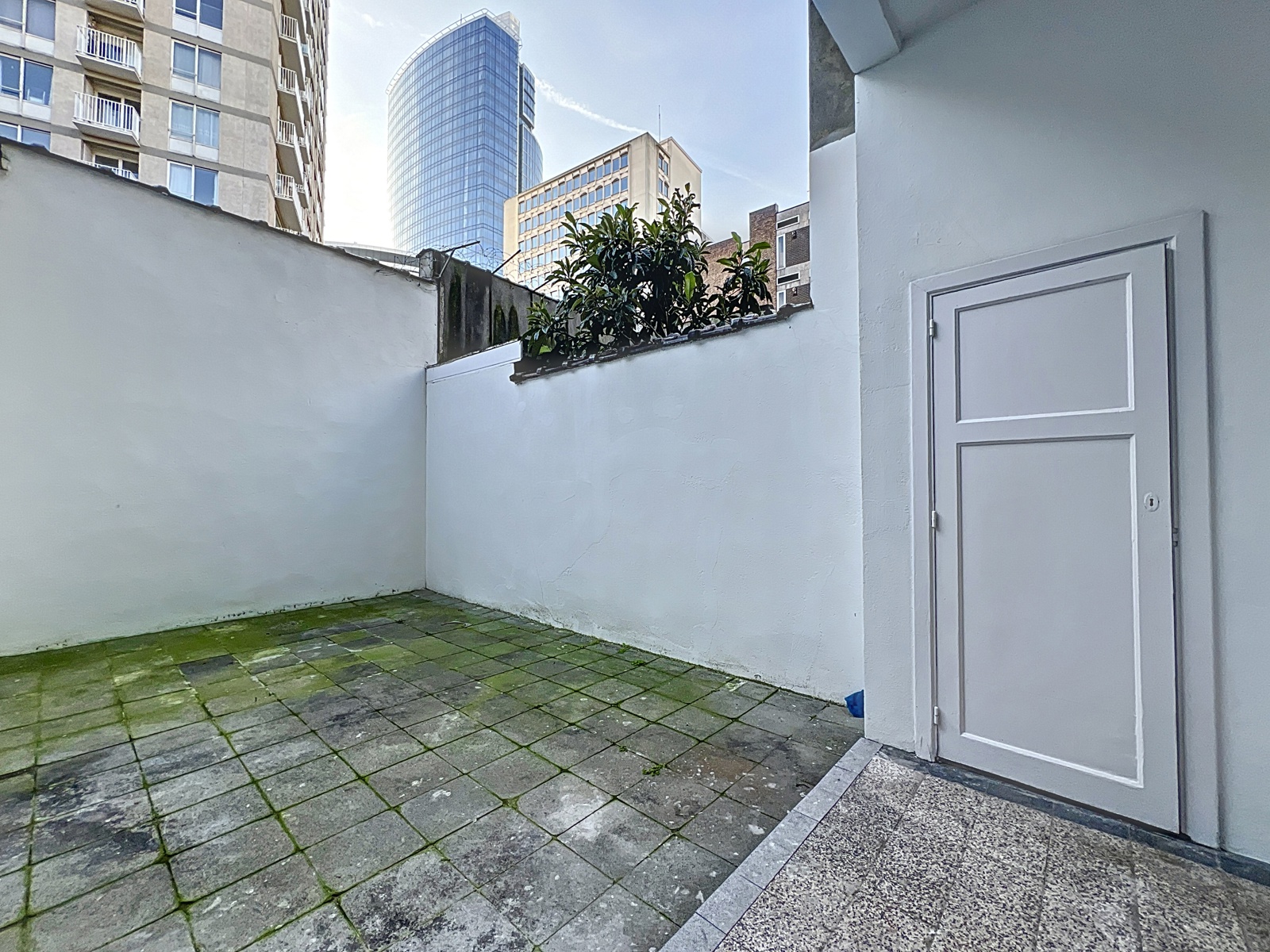 UNDER OPTION! Madou district, superb fully renovated apartment of ± 120 m² gross in a small building. It is composed as follows: Entrance hall of ± 6.5 m², cloakroom and separate toilet, living room of ± 25 m², fully equipped kitchen of ± 16.5 m² with dining area, master bedroom of ± 23.5 m² (bedroom, dressing room, shower room and wc), second bedroom of ± 14.7 m², shower room, courtyard of ± 21.5 m² facing south. Also: Double glazing, laundry room, individual gas boiler, front shutters, standard electricity, cellar. Low charges! PEB before renovation: D+. To discover as soon as possible!
