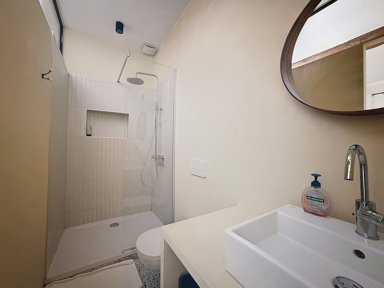 Rez-de-chaussée : Hall d'entrée avec toilette séparée de ± 7.6 m², chambre de ± 11 m² avec salle de douche privative de ± 3.6 m².